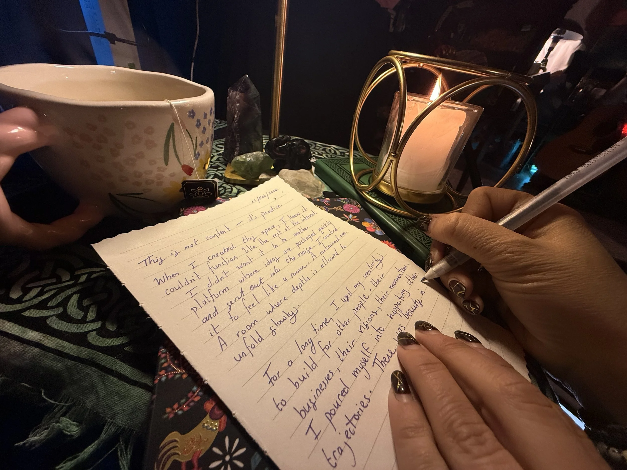 For a long time, I used my creativity to build for other people: their businesses, their visions, their momentum. I poured myself into supporting other trajectories. There was beauty in that, and I’m grateful for what it taught me. But somewhere along the way, I realized I hadn’t created that same level of intention and protection for my own becoming.